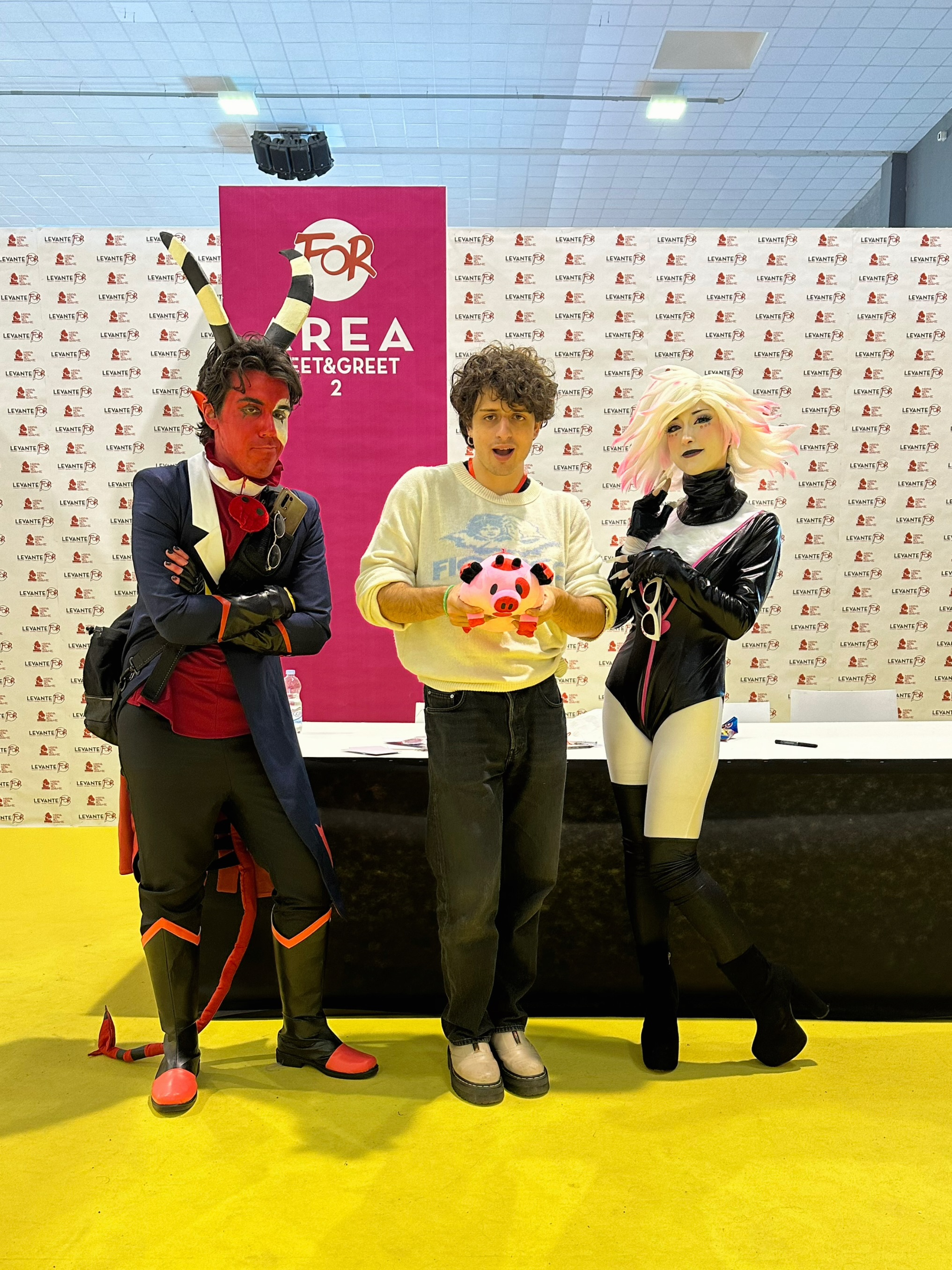 On Sunday was the last day of con and it was HAZBIN HOTEL DAY! If you follow me on tiktok you should know I'm a BIG Vivzieverse fan XD That day I was Angel Dust with my friend Fede as Blitz and Nericchi as Lute!